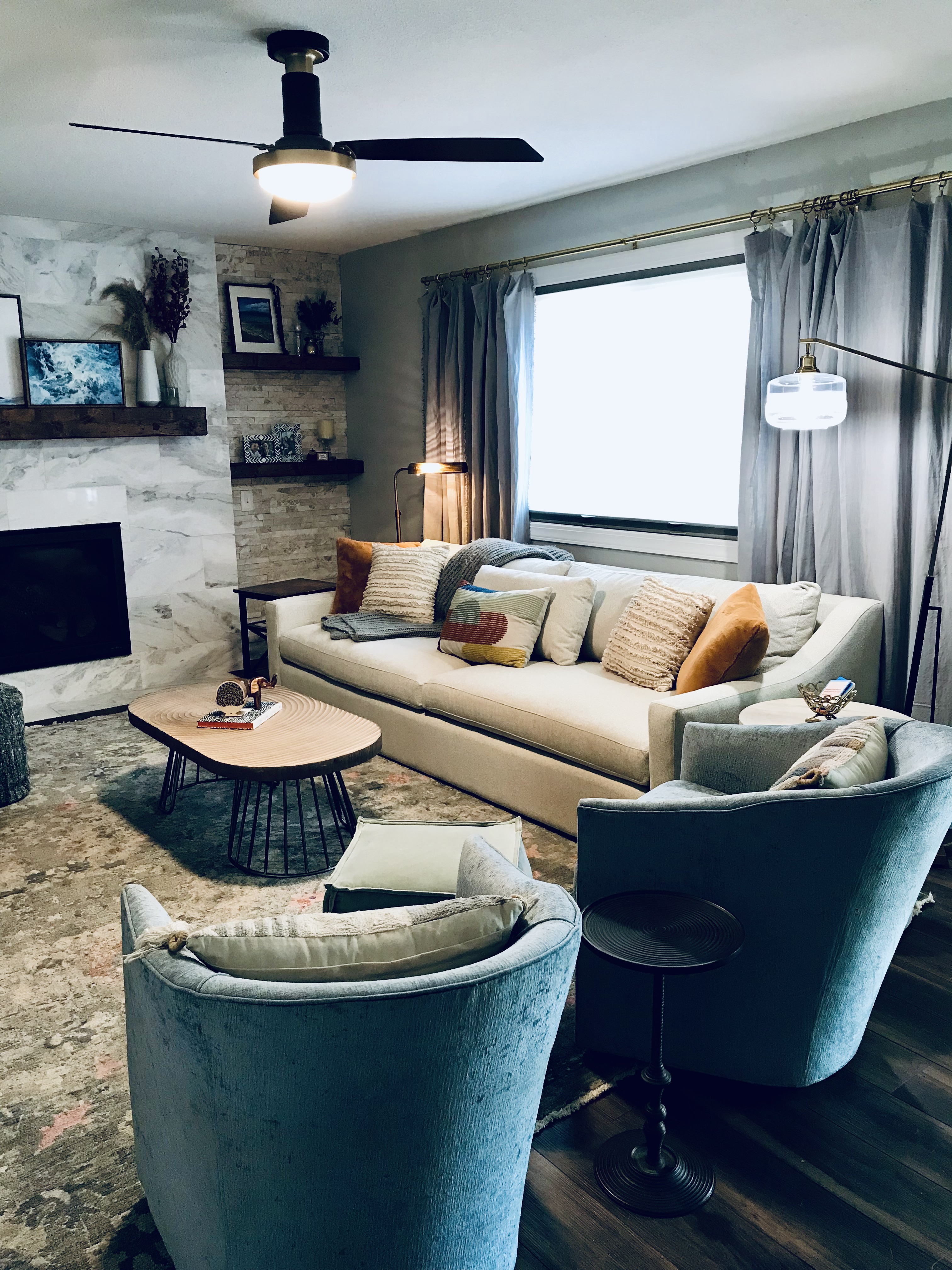This client was in dire need of a fresh start. Not only did her life need some updating, so did her mid-century modern home and I was honored to be of service! We replaced flooring, window treatments and painted throughout, modernized her fireplace with gorgeous marble and floating rustic shelves and carefully selected all new furnishings. Now she can come into this space to relax, reflect and focus on her future.