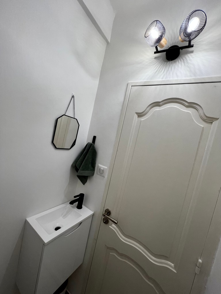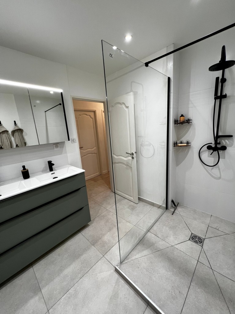 The bathroom was the other challenging space. We decided to eliminate the tub and replace with a walk-in shower. This room also housed the washer/dryer combo so we moved that into the kitchen and provided a larger space for a drop-in vanity and mirror. We added a decorative shelf where the vanity used to be. This design really opened up the space and provided better function and storage!