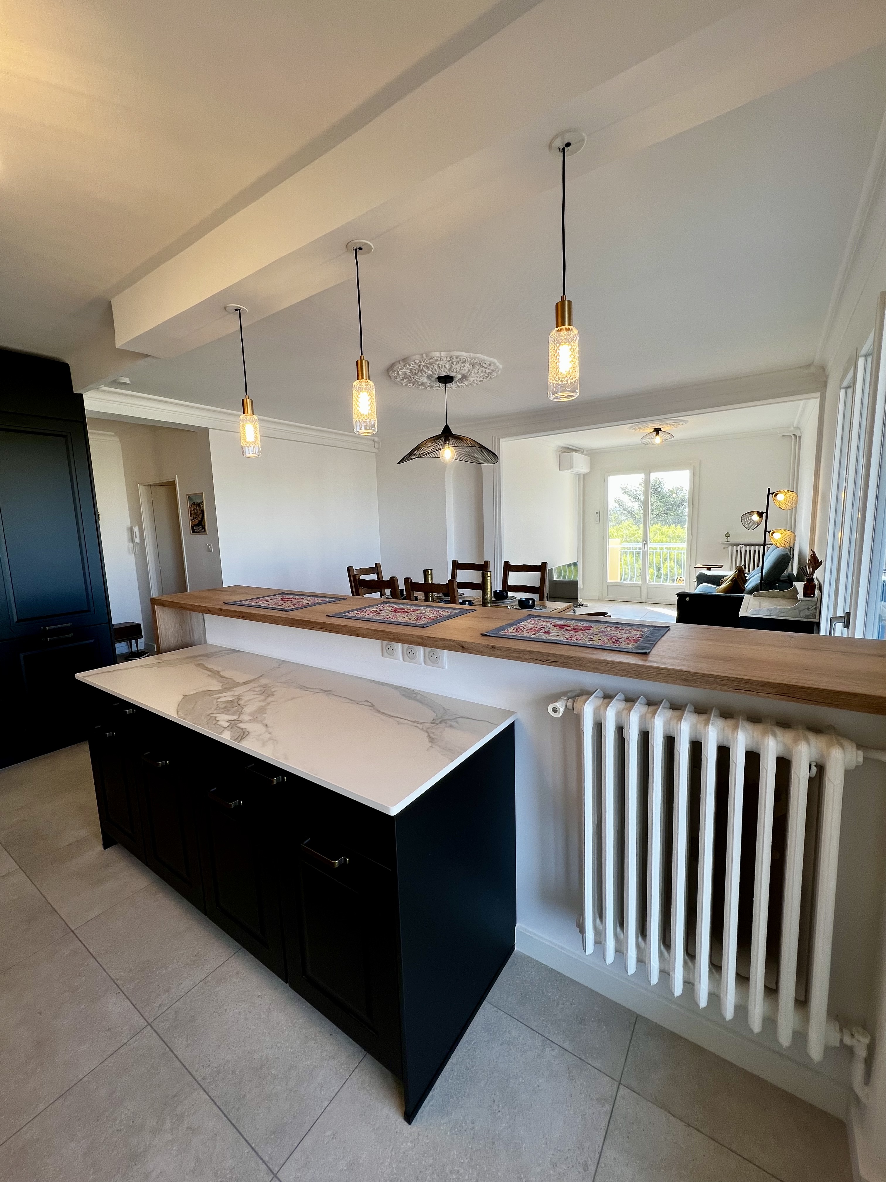 This apartment building was built in the early 1960’s. This unit started as a 3 bedroom and a previous owner knocked down a wall to incorporate a living space. My clients desired an open concept kitchen/dining so we knocked down another wall and designed a new, more functional kitchen and bar. See below!