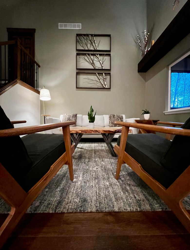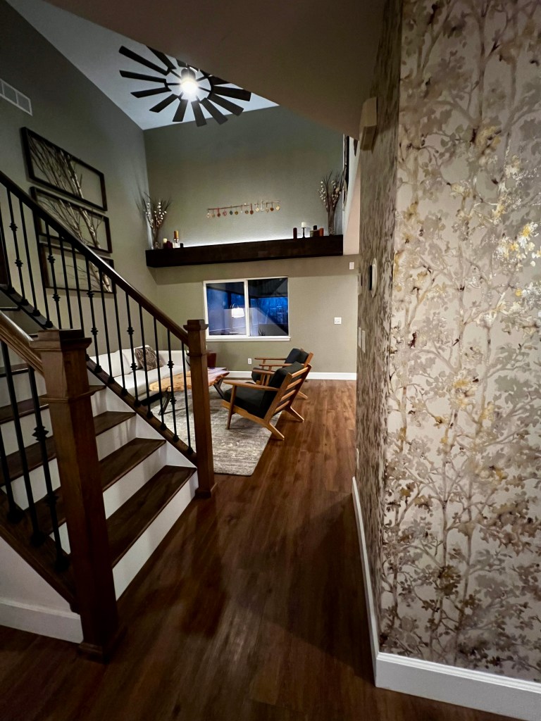 With the aid of a digital rendering, I helped them understand what I envisioned. I recommended a layout that encourages intimacy and conversation. When we met, the clients were already in the process of updating their stair railing and doors, which were going flow beautifully with the design plan. The paint color we selected was a warm, green-based gray, which complemented the red undertones in their existing flooring and trim. We resourced a couple hand-crafted accent tables to allow ease into and around the space and added minimal ambient lighting. We enhanced the soffit to appear like a rustic beam and transformed the pantry into an artistic centerpiece by wrapping it in a gorgeous, metallic floral wallpaper. Minimal wall decor (hung a bit higher to mitigate possible destruction by their 2 rowdy boys, lol, and a few more plants will be added to the space over time.