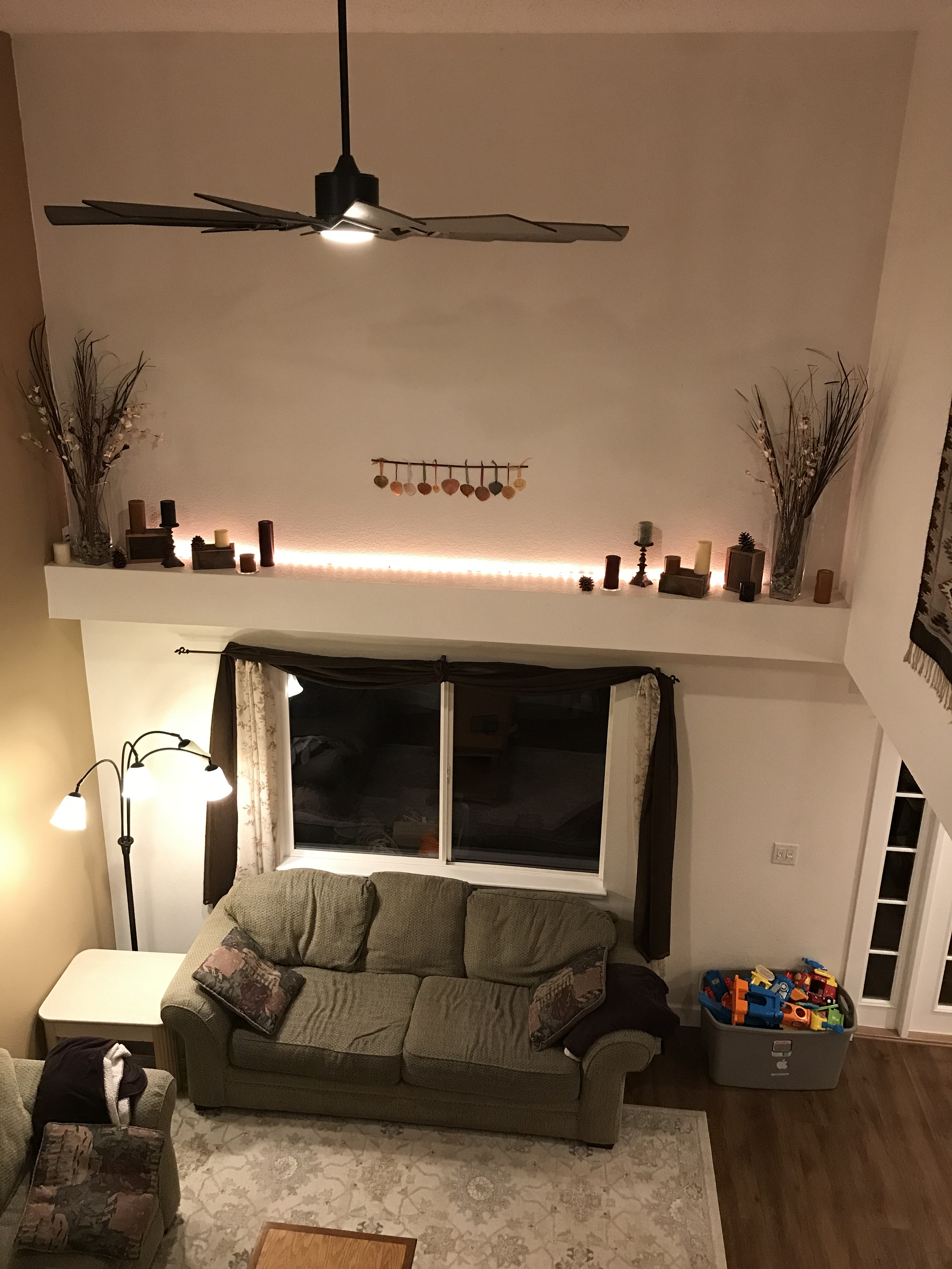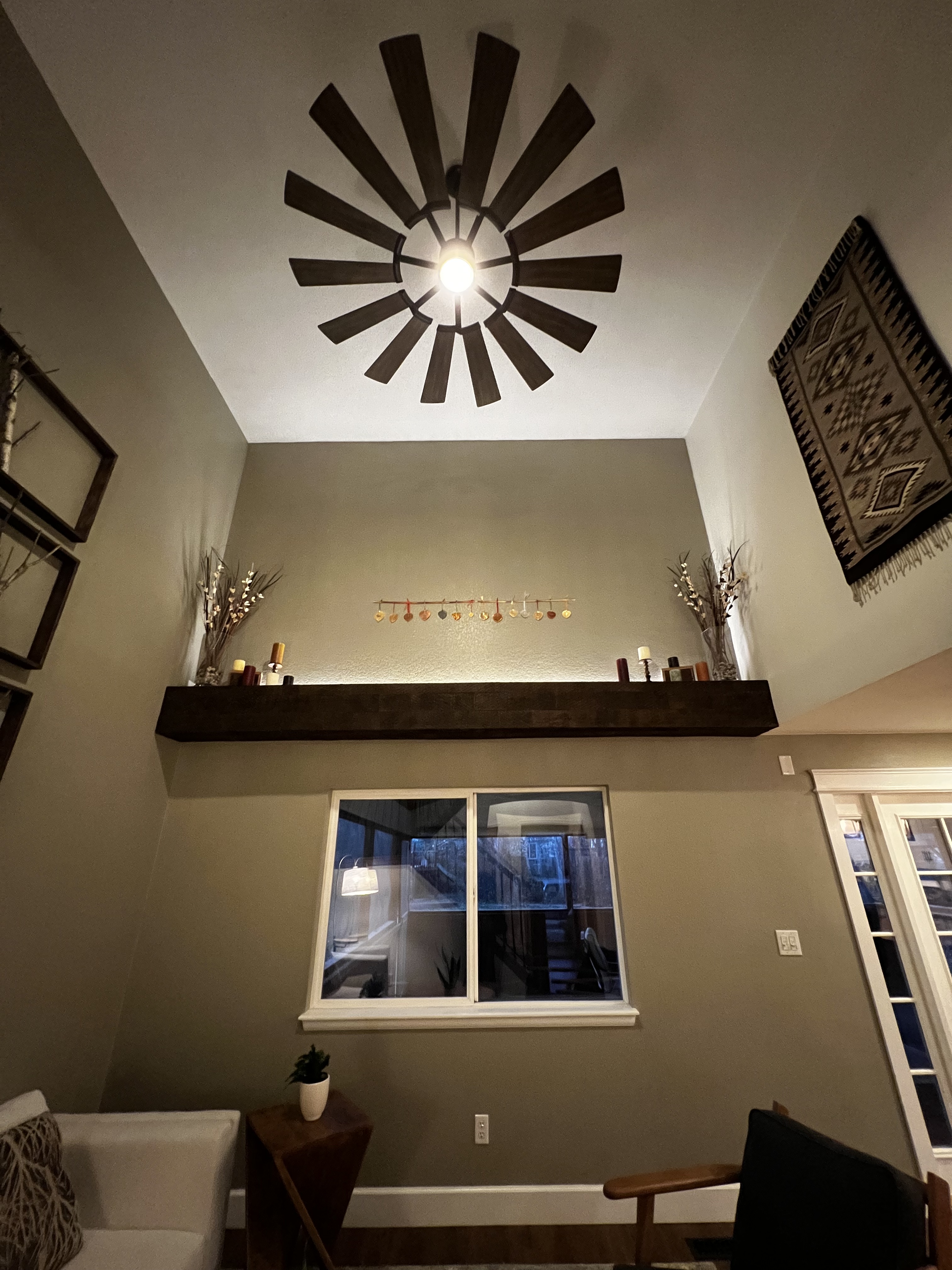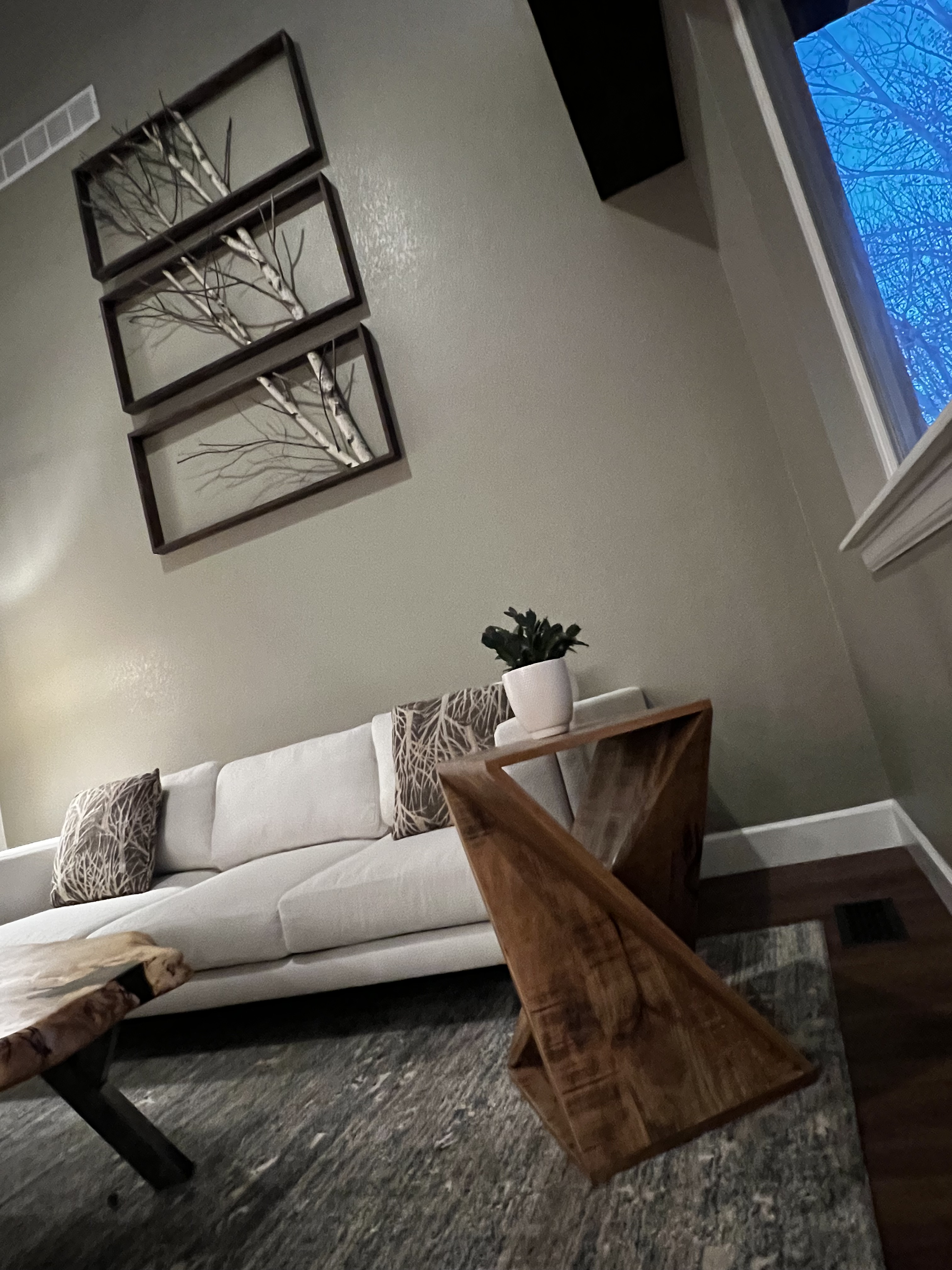 With the aid of a digital rendering, I helped them understand what I envisioned. I recommended a layout that encourages intimacy and conversation. When we met, the clients were already in the process of updating their stair railing and doors, which were going flow beautifully with the design plan. The paint color we selected was a warm, green-based gray, which complemented the red undertones in their existing flooring and trim. We resourced a couple hand-crafted accent tables to allow ease into and around the space and added minimal ambient lighting. We enhanced the soffit to appear like a rustic beam and transformed the pantry into an artistic centerpiece by wrapping it in a gorgeous, metallic floral wallpaper. Minimal wall decor (hung a bit higher to mitigate possible destruction by their 2 rowdy boys, lol, and a few more plants will be added to the space over time.