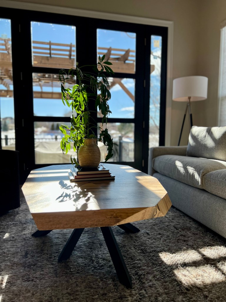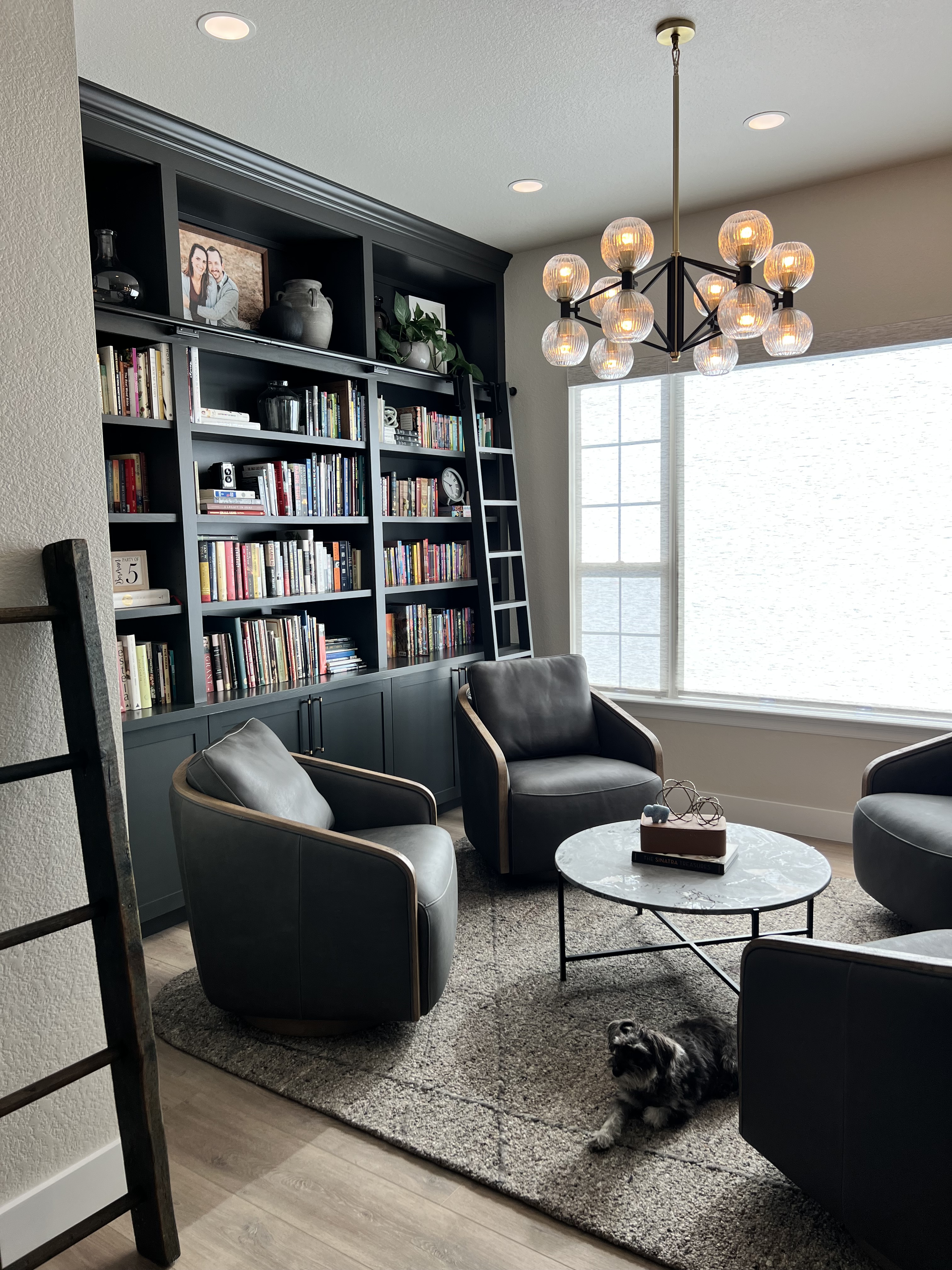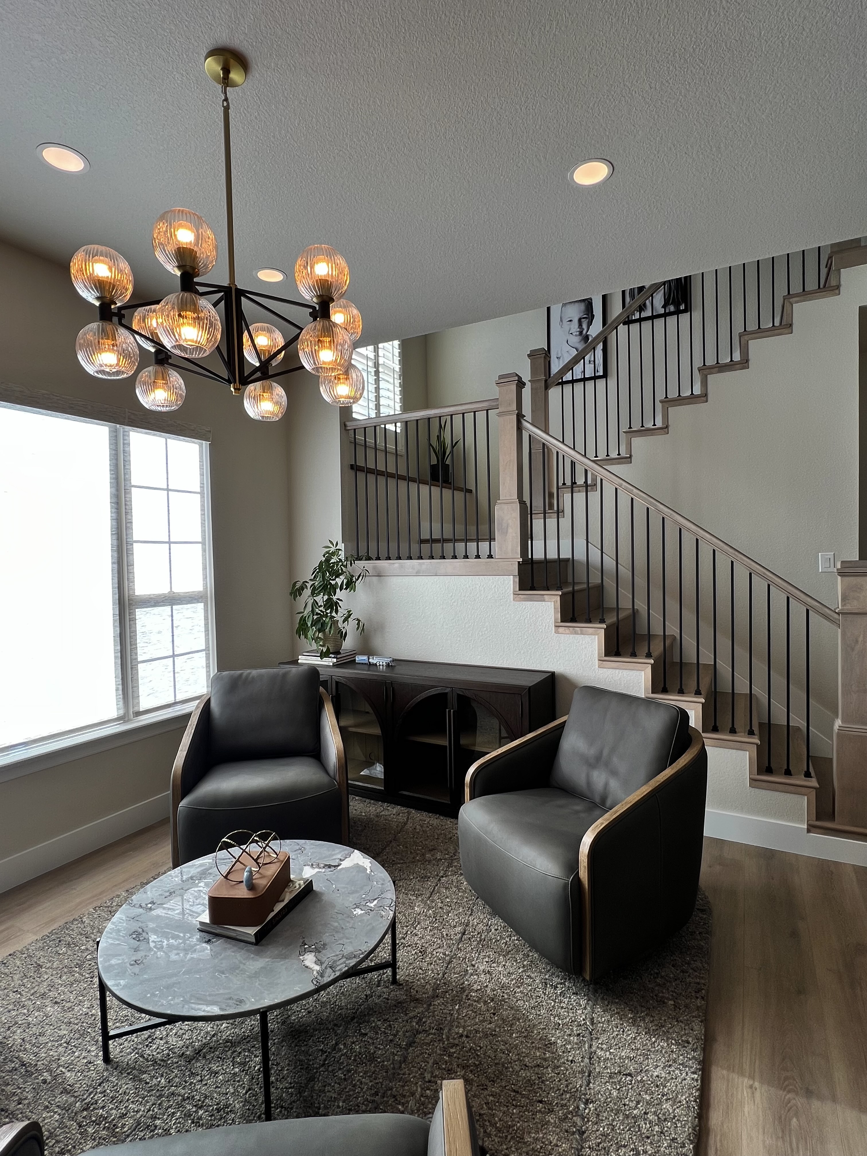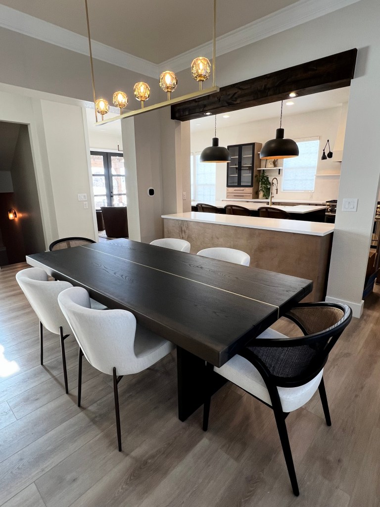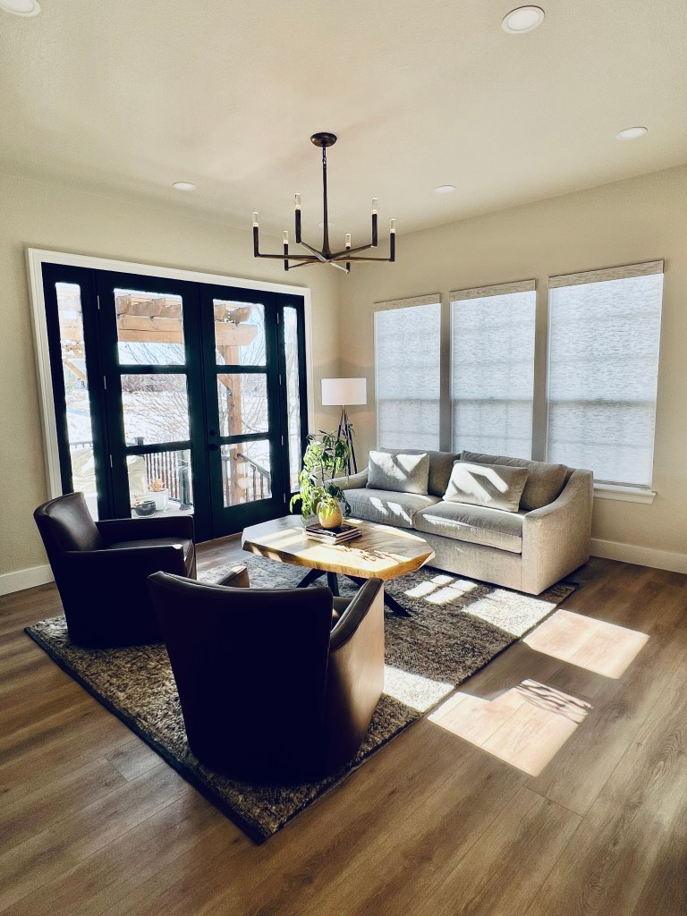 Installed a rustic beam and puck lighting to bring more visual interest above eye level. Purchased all new rugs, furniture for all spaces on the main level.