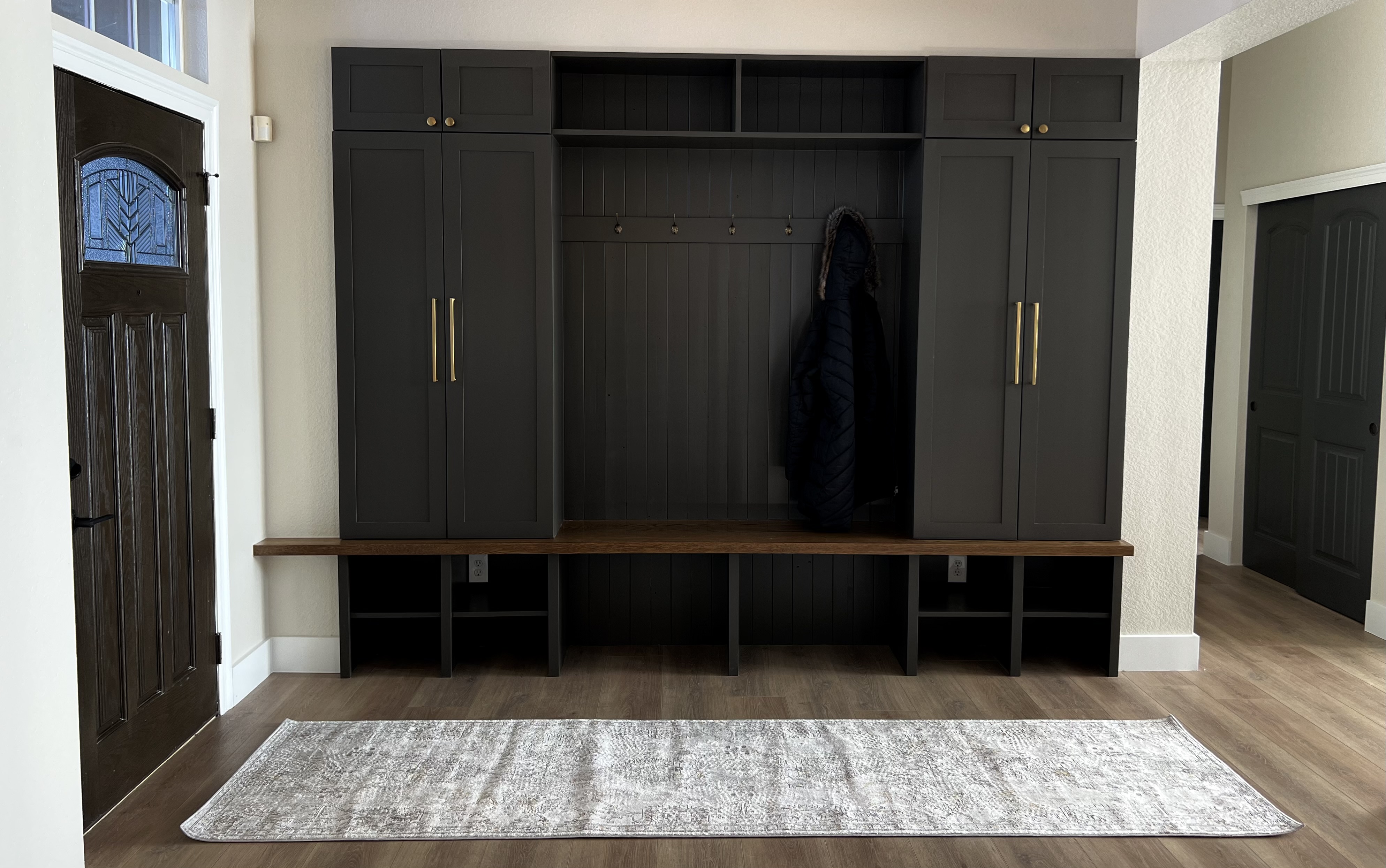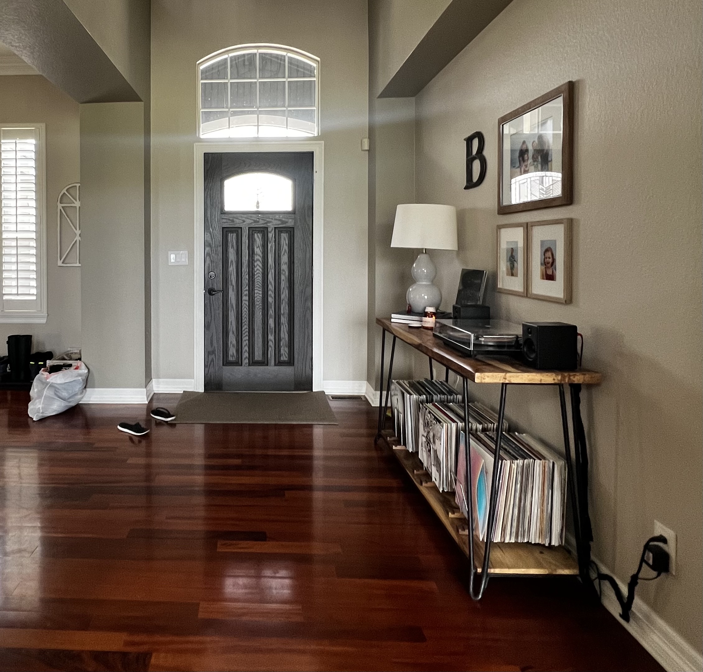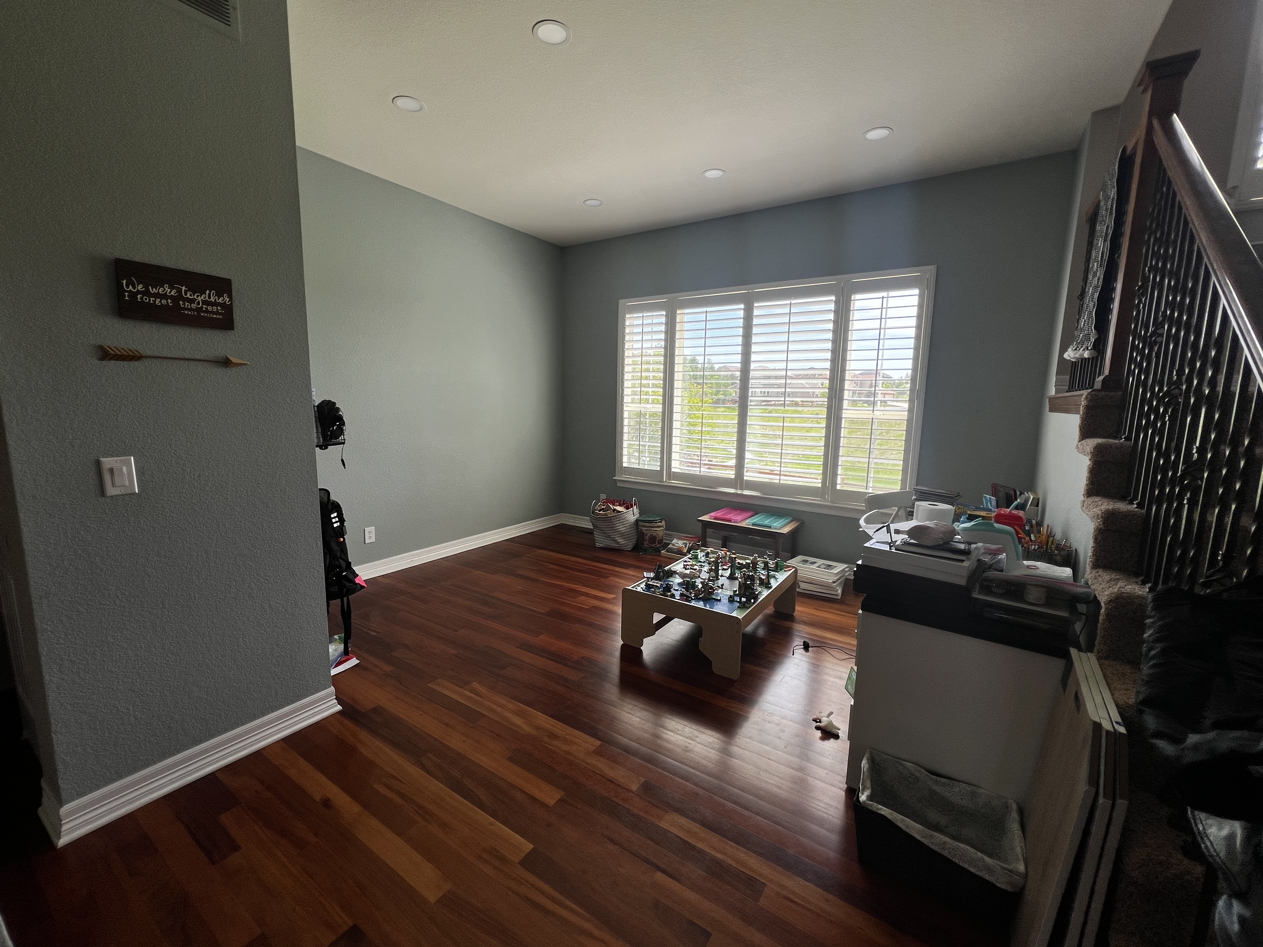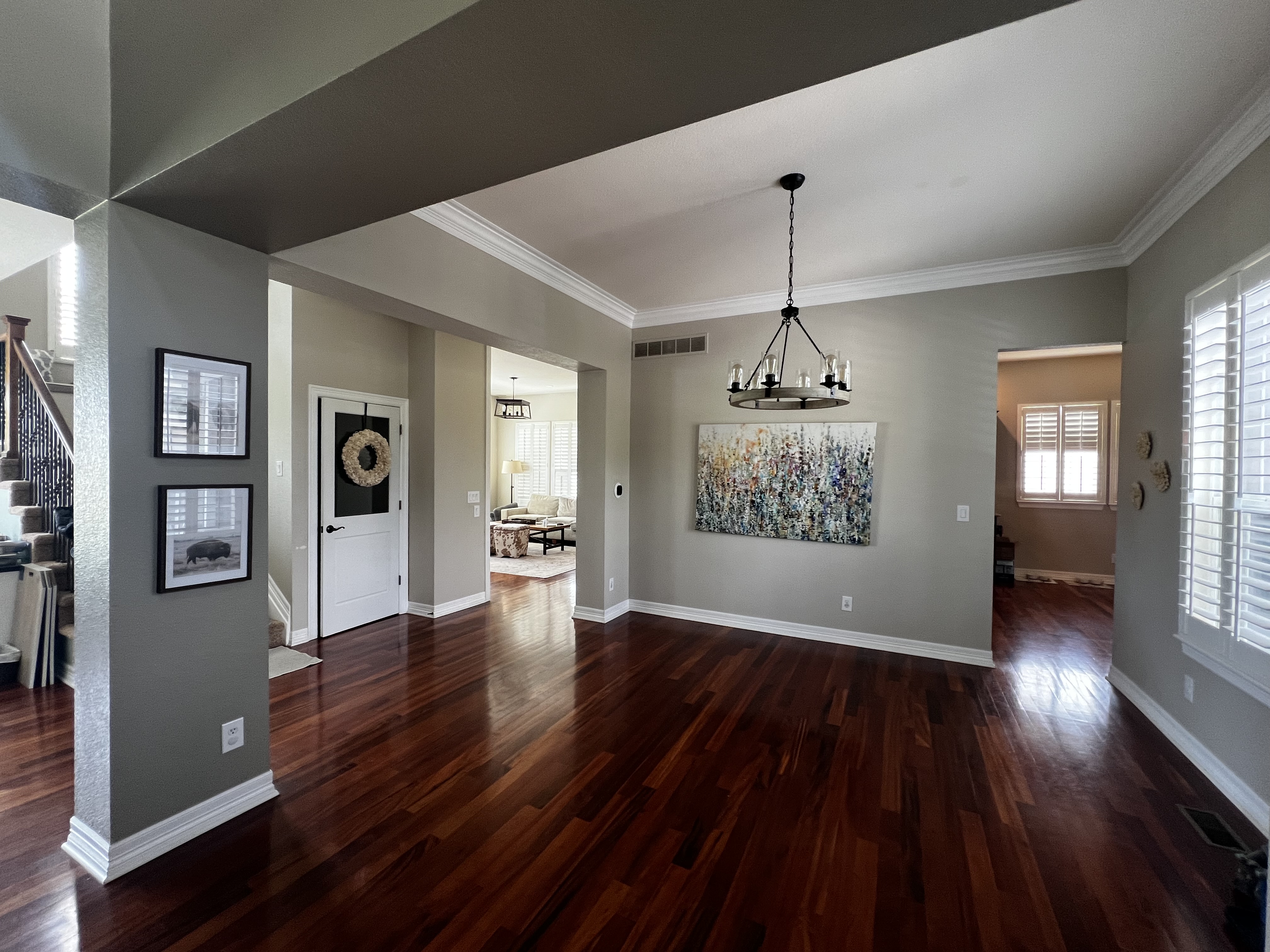 Installed a rustic beam and puck lighting to bring more visual interest above eye level. Purchased all new rugs, furniture for all spaces on the main level.